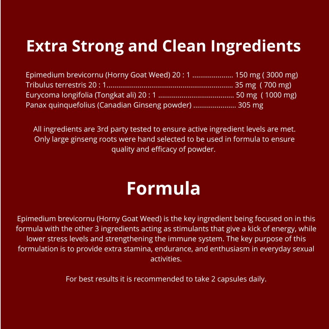Made with Canadian ginseng, Epimedium brevicornu, Tribulus terrestris and Eurycoma longifolia.
